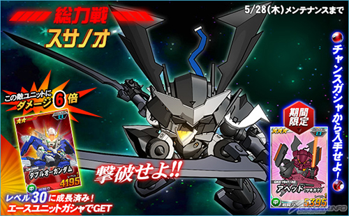 同機を倒した際に引くことができるチャンスガシャには「★3 アヘッド(サキガケ)」などを獲得できるチャンスがあるほか、エースユニットガシャには「スサノオ」に対し6倍の攻撃力を発揮する「★2 ダブルオーガンダム」が追加された。