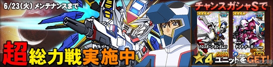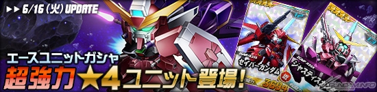 エースユニットガシャに「★4 インフィニットジャスティスガンダム」、「★4ジャスティスガンダム」、「★4 セイバーガンダム(MS)」など、強力なユニットが登場した。