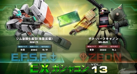 期間中に戦闘報酬から入手可能な「EXガシャコンチケット」でプレイできる期間限定のガシャコン「EXガシャコン」の第13弾では、地球連邦軍に「ジム後期生産型(強襲装備)」が、ジオン公国軍に「ザク・ハーフキャノン」がそれぞれ新参戦する。