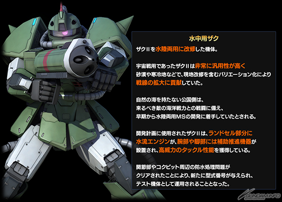 「水中用ザク」は、ジオン公国軍がザクIIを水陸両用に改修した機体。自然の海を持たない公国軍は、早期から水陸両用MSの開発に着手していたとされ、開発計画に使用されたザクIIはランドセル部分に水流エンジンが、腕部や脚部には補助推進機器が設置され、高威力のタックル性能を獲得している。