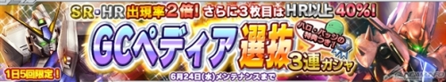 GCペディアの中で「★4」以上の評価を受けている注目度の高いカードから、運営チームが選定した1日5回限定のガシャ。1~2枚目はSR・HRの出現率が2倍、さらに3枚目はHR以上の出現率が40%となっている。