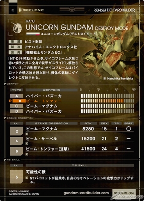 ▲アルファロケテスト版のメカニックカード[コモン]は「ユニコーンガンダム(デストロイモード)」。