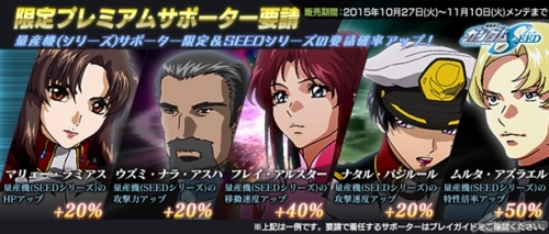本日より期間限定で、限定プレミアムサポーター要請が提供される。量産機(シリーズ)の性能が上昇するサポーターのみが出現するなど、今回のイベントでも登場する『機動戦士ガンダムSEED』シリーズのサポーターが多く登場する。販売期間は11月10日(火)メンテナンスまで。