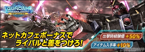 本日より、「ガンダムジオラマフロント」では、「公認ネットカフェ」サービスがスタートした。全国の「公認ネットカフェ」からゲームをプレイすると、特典として「獲得経験値+50%アップ」や「アイテムドロップ率10%アップ」など、ネットカフェからのプレイを強力サポートするお得な特典が満載となっている。