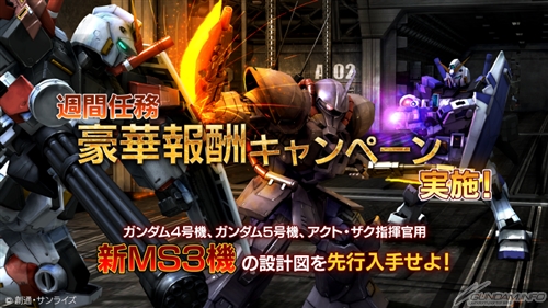 報酬内容は新規参戦の「ガンダム4号機」、「ガンダム5号機」、「アクト・ザク指揮官用」の設計図をはじめとして、出撃エネルギー、開発ポイント、バトルメモリー、配給整備券や過去に配信されたイベント設計図など盛りだくさんとなっている。
