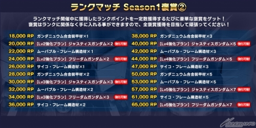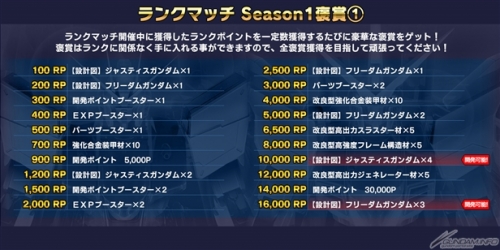 獲得したRPに応じて機体設計図などの様々な特典を入手できる他、ランクマッチ終了時に所属していたランクに応じて、次回シーズン期間中にボーナスが発動する。