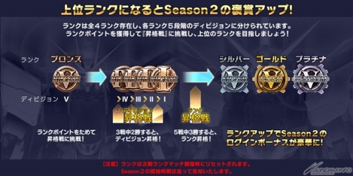 ランクマッチSeason1終了時のランクに応じて、「Season2」期間のログインボーナスが豪華になる。ランクは、次回のランクマッチ開催時にリセットされるが、今回のランクマッチの成績によるSeason褒賞は、次のランクマッチが開催されるまでの「Season2」期間中はずっと発動するため、「今回のランクマッチでいかに上位ランクへ到達できるか」が重要になる。