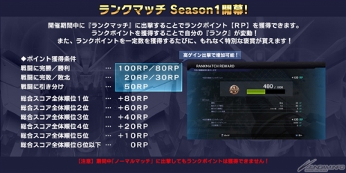 開催期間中に「ランクマッチ」のゲームタイプを選んで出撃することで、ランクマッチに参加可能。戦闘を終えると、自らの部隊の勝敗や、自身のスコアに応じたRPを獲得することができる。