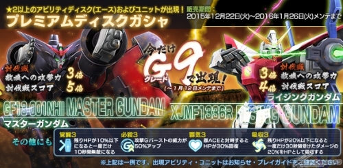 イベント開催期間中は、特別バトル「討伐戦」が出現し、『機動武闘伝Gガンダム』に登場した強敵が立ちふさがる。強敵を撃破し、各ステージで勝利を目指そう。開催期間は2016年1月12日(火)メンテナンス開始まで。