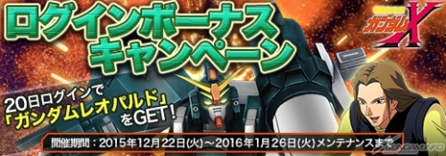 キャンペーン開催期間中は、初回ログイン時に「ログインキャンペーンシート」へスタンプが1つ押され、設定されたアイテムが獲得できる。20日のログイン達成で『機動新世紀ガンダムX』に登場する「ガンダムレオパルド」がプレゼントされる。