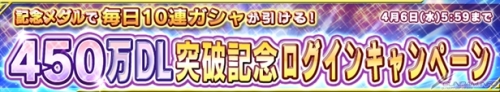 累計450万ダウンロード突破を記念して、期間中のログイン日数に応じて10連ガシャが引ける「450万DL突破記念メダル」と、ゲーム内で豪華アイテムと交換できるイベントバッジがプレゼントされる。