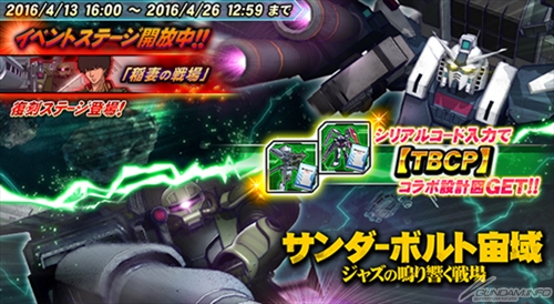 キャンペーン期間中は、イベント「サンダーボルト宙域~ジャズの鳴り響く戦場~」が開催され、イベントステージとしてジオン公国軍リビング・デッド師団曹長ダリル・ローレンツの登場するステージが解放されるほか、シリアルコード「TBCP」を入力することで、フルアーマー・ガンダムとザクII(ビッグ・ガン装備)の設計図を獲得することができる。開催期間は4月26日(火)12:59まで。