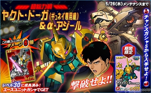 超総力戦には5月26日(木)までの期間限定で「ヤクト・ドーガ(ギュネイ専用機)&α・アジール」が登場し、期間中に任務を実行するとまれに遭遇することがある。