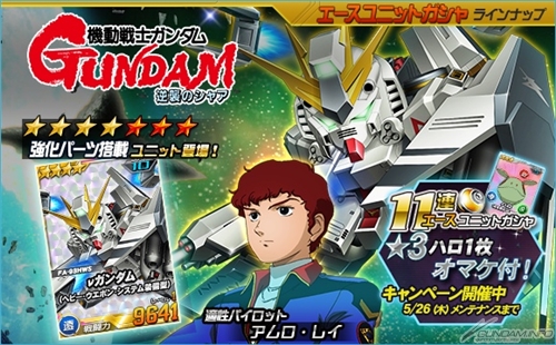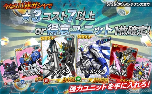 キャンペーン期間中、「11連エースユニットガシャ」を引くと、最後に登場する1体が、必ず★3コスト7以上の機体か、開催中の総力戦、超総力戦の得意ユニットとなり、おまけとして★3ハロが1枚付いてくる。この機会に強力なユニットを手に入れよう。開催期間は5月26日(木)メンテナンス開始まで。