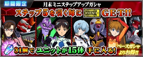 開催中の「月末ミニステップアップガシャ」では、『ヱヴァンゲリヲン新劇場版:序』と『ヱヴァンゲリヲン新劇場版:破』のSSRユニットが登場する。初回はΩクリスタル1個から引け、Ωクリスタル計31個でユニットが15体入手でき、さらにイベントチケットをもらえるチャンスもあるので、ぜひとも参加しよう。開催予定期間は5月31日(火)23:59まで。