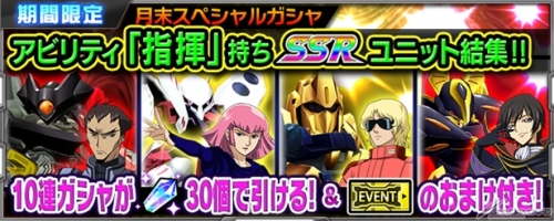 開催中の「月末スペシャルガシャ」には、味方ユニットの攻撃力をアップさせるアビリティ「指揮」を持ったSSRユニットが集結。10連で引くとイベントチケットのおまけ付きとなっている。この機会にチームの攻撃力強化を図ろう。開催予定期間は5月31日(火)23:59まで。