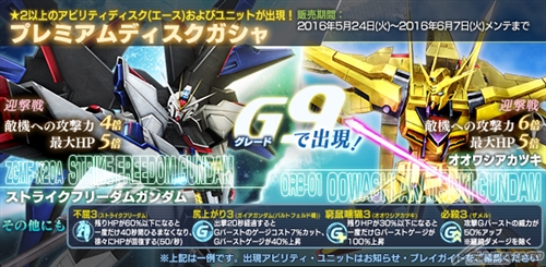 ガシャステーションの内容が更新され、新たに「ストライクフリーダムガンダム」や「オオワシアカツキ」など計4ユニットが登場する。いずれも同時開催中の迎撃戦イベント「自由と正義と運命と」にて役立つ特効ステータスが発動するほか、「GRADE9」に改修済みの状態で出現する。さらに、今回より迎撃戦のスコア獲得で鍵となる、出撃EN(エネルギー)が他のユニットと比べて軽減されているため、よりハイスコアを狙いやすくなる。