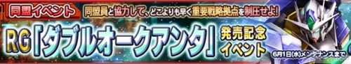 ガンプラ「RG ダブルオークアンタ」の発売を記念するイベントで、期間中はイベント用のルームを作成するか、同盟員が作成したルームに参加することでイベント用の戦争マップへ出撃できる。同盟員と協力して敵エース部隊を倒しつつ、重要戦略拠点を陥落させよう。