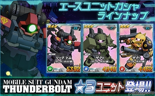本日よりエースユニットガシャに、武装として「ビッグ・ガン」を装備する「★3 リック・ドム(サンダーボルト版)」や、「★3 ザクII(サンダーボルト版)」、「★3 ザクI(サンダーボルト版)」が追加された。また、プラチナパイロットガシャに「★3 ダリル・ローレンツ」、「★3 フィッシャー・ネス」、「★3 ショーン・ミタデラ」が登場しているので、あわせてチェックしよう。