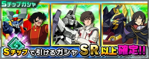 ユニットの売却やミッションクリアで手に入る「Sチップ」を引くことができる「Sチップガシャ」が新設された。SR以上確定となっているので、チーム強化に役立てよう。現在ピックアップされているユニットは「ユニコーンガンダム」、「ガウェイン」、「マジンガーZ(JS)」などで、順次変更される予定となっている。