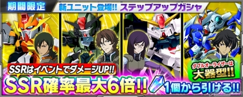 開催中の「ステップアップガシャ」では、『機動戦士ガンダム00』セカンドシーズンの4ユニットが新登場。SSRは開催中のイベント「あるべき世界」にて、敵ユニットに与えるダメージが通常の3倍となっている。開催予定期間は6月23日(木)13:59まで。