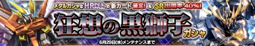 5連ガシャには「狂想の黒獅子メダル1~3枚」、「合成強化ガシャメダル×5枚」が特典として付き、「狂想の黒獅子メダル」を10枚消費することで、HR以上新規カード確定でSR出現率40%の「狂想の黒獅子メダルガシャ」を利用できる。