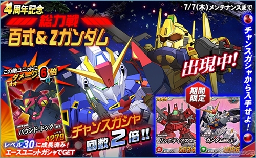 4周年記念総力戦には7月7日(木)までの期間限定で「百式&Ζガンダム」が登場し、期間中に任務を実行するとまれに遭遇することがある。