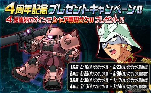 ■ 毎週もらえる!「4周年記念『★3 シャア専用ザクII』プレゼントキャンペーン」開始!