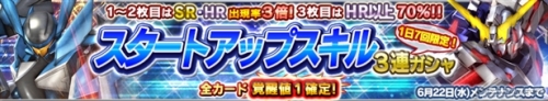 スタートアップスキルを持つ機体のみで構成されたガシャ。1日7回限定で、1枚目から2枚目のSR・HR出現率3倍、3枚目はHR以上出現率70%となっている。さらに、出現するカードはすべて「覚醒値1」確定。