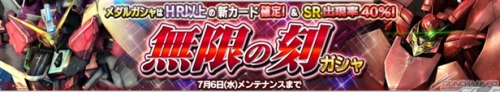 5連ガシャには「無限の刻メダル1~3枚」、「合成強化ガシャメダル×5枚」が特典として付き、「無限の刻メダル」を10枚消費することで、HR以上新規カード確定でSR出現率40%の「無限の刻メダルガシャ」を利用できる。