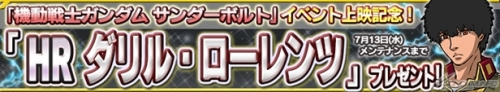 『サンダーボルト DECEMBER SKY』のイベント上映開始を記念して、期間中にゲームへログインするだけで、「HR ダリル・ローレンツ」がパイロットLv99、スタミナMAXの状態でプレゼントされる。