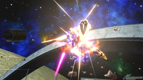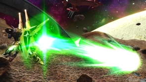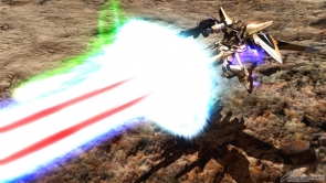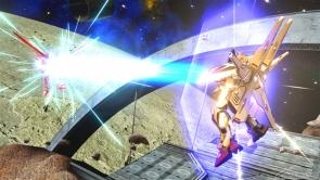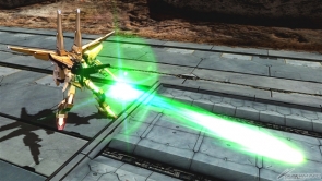 【右】チャージ射撃武装「一斉発射」は、ビームライフルと高エネルギービーム砲からビームを発射する。