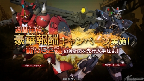 開催期間中に出撃すると、条件に応じてキャンペーンポイント[CP]がカウントされ、一定数達成するごとに特別な報酬がプレゼントされる。新MS「ガンナーガンダム」、「ギャン・エーオース」の設計図も先行入手できるようになるので、ぜひプレイしてみよう。