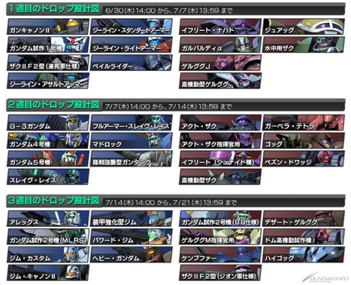 3週に分けて、過去の期間限定機体がすべてドロップ。第1週目は「ガンキャノンII」、「イフリート・ナハト」などの設計図となっている。ドロップする設計図と期間の詳細は、 ゲーム公式サイトをご覧ください。