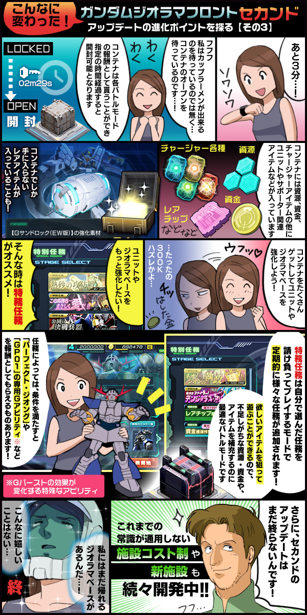 第3回は、報酬としてもらえる「コンテナ」の楽しさや、ユニットやジオラマベースを強化したい人にオススメな「特別任務」を紹介していくぞ!