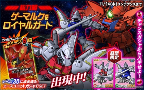 総力戦に「ゲーマルク&ロイヤルガード」出現。エースユニットガシャに「★2 キュベレイMk-II(プルツー仕様)」などが登場。特殊任務「オペレーションチップ奪還作戦」、「潜入ミッションイベント」に加え、「ガンダムバトルコロシアム」、「獲得PPアップキャンペーン」も同時開催。