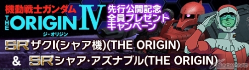 『THE ORIGIN IV 運命の前夜』のイベント上映を記念して、「FR ザクI(シャア機)(THE ORIGIN)」、「FR シャア・アズナブル(THE ORIGIN)」が期間内にログインしたユーザー全員にプレゼントされる。