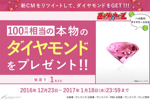 TVCM放送を記念して開催される「“カワイイけど、本気。”な新CMリツイートキャンペーン」では、「LINE: ガンダムウォーズ」の Twitter公式アカウントをフォローして、キャンペーンツイートを「#カワイイけど本気」のハッシュタグを付けてリツイートすると、抽選で1名にハロ型のダイヤボックスに入った100万円相当のピンクダイヤモンドがプレゼントされる。