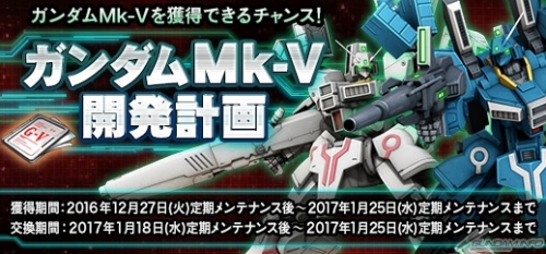 12月に正式サービススタートから4周年を迎え、5年目がスタートした本タイトルでは、“5”にちなんだ機体「ガンダムMk-V」が獲得できるイベント「ガンダムMk-V開発計画」が、本日12月27日(火)より開催中だ。