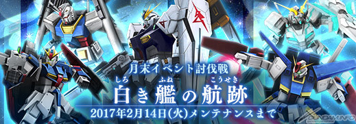 月末イベント討伐戦「白き艦の航跡」開催。専用MAPに出現するボスを討伐することでMA「サイコガンダムMk-II」など様々な報酬を獲得出来る。プレミアムディスクガシャ内容変更で特効付、GRADE9に改修済みの「ガンダムDX」と「Ζガンダム(ウェイブライダー形態)」が登場。