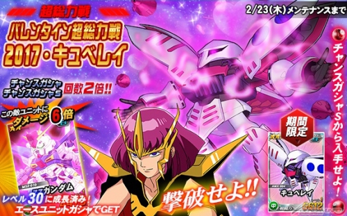 超総力戦に「バレンタイン超総力戦2017・キュベレイ」が登場。エースユニットガシャに「★4 アストレイゴールドフレーム天ミナ(オキツノカガミ装備型)」など登場。バレンタインエースガシャキャンペーン開催。バトルイベント第8回「艦隊戦」、「パイロット合成経験値アップ期間」、「任務獲得GPアップ期間」開始。