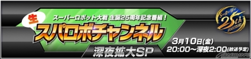 「スーパーロボット大戦」シリーズ生誕25周年記念番組「生スパロボチャンネル」が、3月10日(金)20:00より配信されることが決定した。今回は、「深夜拡大スペシャル」と銘打ち、2部構成・6時間にわたり配信予定。