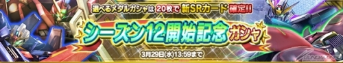 「シーズン12開始記念ガシャ」開催。「SR Ζガンダム」、「SR キュベレイMk-II(プルツー専用)」など新カード合計24枚がラインナップ。ガンダムゲーム30周年記念機体「SR ホットスクランブルガンダム(紅の彗星)」プレゼント、「シーズン12開始記念ログインキャンペーン」など各種キャンペーンも。