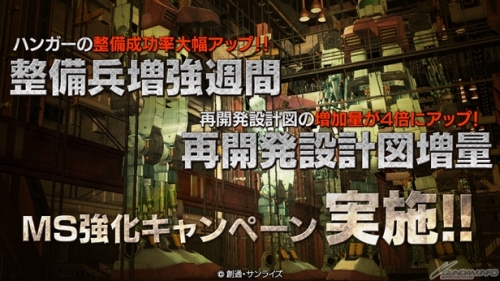 3月23日(木)13:59まで整備兵増強・再開発設計図増量の「MS強化キャンペーン」開催。アップデートにより、既存MS・既存兵装・カスタムパーツの上位レベル追加、マップ入れ替え、シチュエーション入れ替え。「出撃エネルギーキャンペーン」も実施中。