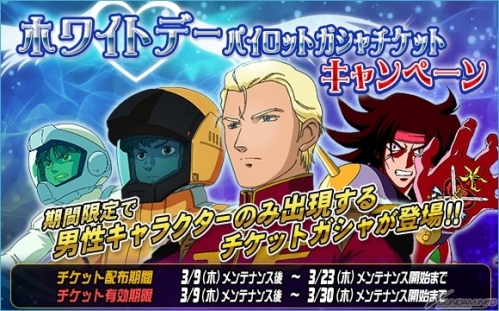 「ホワイトデーイベント」開催。期間中は総力戦の指令報酬の一部に「ホワイトデーパイロットガシャチケット」追加。チャンスガシャからは「ホワイトデーイベントカード」入手可能。「ホワイトデーログインボーナスキャンペーン」、特殊任務なども。総力戦に「ガンダム・キマリス」登場。エースユニットガシャ更新。