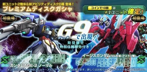 『機動戦士ガンダムAGE』をテーマにした特別任務 「無邪気な悪魔」発令。ステージクリア報酬で、エース「ゼダス」と、関連した専用アビリティや専用Gアビリティ獲得のチャンス。 プレミアムディスクガシャ更新で新機体「ガンダムAGE-2 ノーマル」と「イージスガンダム(MA形態/アスラン隊)」登場。