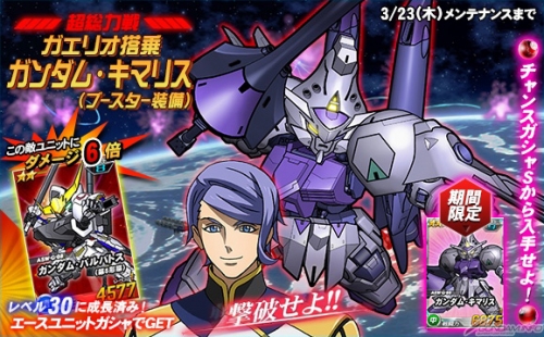 超総力戦に「ガエリオ搭乗ガンダム・キマリス(ブースター装備)」登場。エースユニットガシャラインナップに強力ユニット登場。★3以上「地形適性Sユニット」確率アップキャンペーン開催中。「ユニット合成経験値アップ期間」、「任務獲得GPアップ期間」開始、「新規登録キャンペーン」開催。