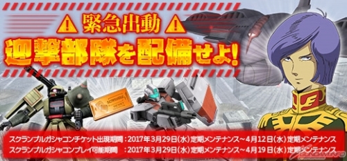 これまでにEXガシャコンにて登場した機体が勢ぞろいするイベント「緊急出動!迎撃部隊を配備せよ!」開催。大規模戦フィールド「キャリフォルニアベース-戦慄の港-」調整で戦術支援に補給艦ビーコン追加、拠点3の東・西側にオブジェクト追加など。「立てよ!ガンオン!ライズアップガシャコン」も解放中。