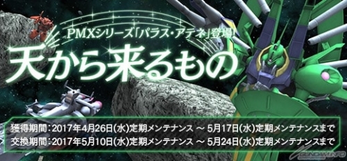 「パラス・アテネ」が獲得できる「天から来るもの」と、期間中全パイロットが獲得した「ジュピトリス製MS開発計画書」の総数に応じてプレゼントが手に入る「ジュピトリス製MS開発計画」開催中。「天から来るもの」Retweetキャンペーン、イベント「Re:Anecdote of Thunderbolt」も。DXガシャコンVOL.44配信開始。