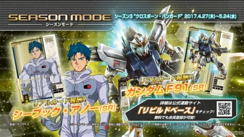 本日4月27日(木)より「シーズン3 クロスボーン・バンガード」がスタートした。本シーズンでは、筐体からは払い出しされない新たなリアルカード「ガンダムF91(SR)」と「シーブック・アノー(SR)」を報酬として手に入れることができる。ゲーム連動サイト「 リビルドベース」にて、ゲームをプレイした回数に応じて「スクラッチ」を開封し、SRカードを含むさまざまな報酬を獲得しよう。開催期間は5月24日(水)まで。